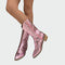 Dámské **kovbojské boty v metalické růžové** barvě, které přitahují pohledy svým jedinečným stylem. Disponují **bohatým vyšívaným vzorem** a bočním zipem pro snadné obutí, zatímco nízký dřevěný podpatek nabízí pohodlí a styl při každém kroku. Ideální pro odvážné street-style looky a módní vystoupení, která se vyjímají.