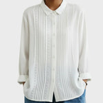 Model Amalie je důkazem, že bílá košile nemusí být nudná. Tento kousek vnáší do šatníku nádech romantiky a vintage stylu. Jemné svislé sklady (sámky) střídané s proužky krajky vytvářejí nádhernou texturu, která působí žensky a propracovaně. Je to ideální volba pro dny, kdy chcete vypadat upraveně, ale zároveň se cítit uvolněně – stačí ji obléknout k džíny a vyrazit.