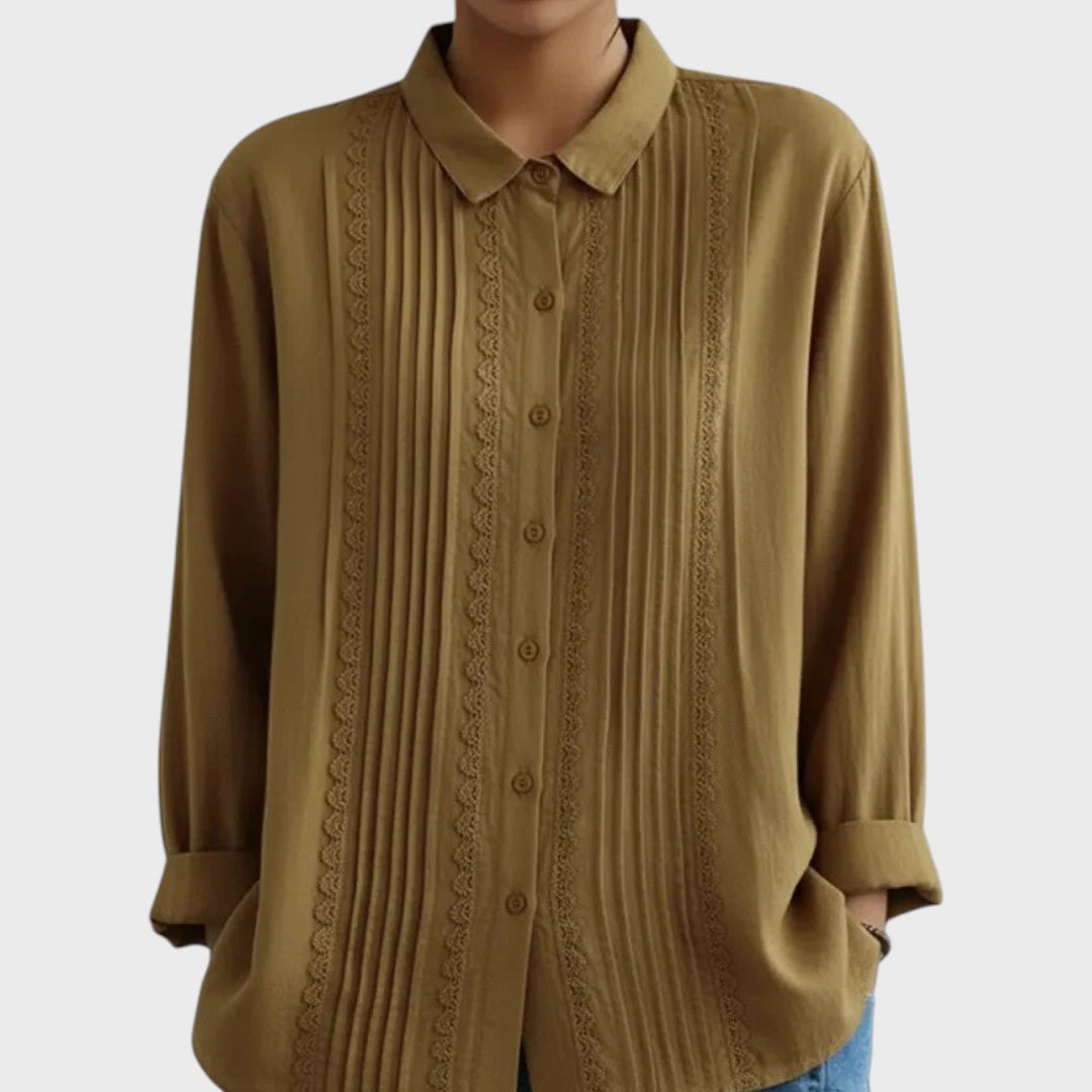 Vintage detaily: Přední strana je zdobena precizním řasením a vsadkami z jemné krajky, což košili dodává historický šarm a eleganci.