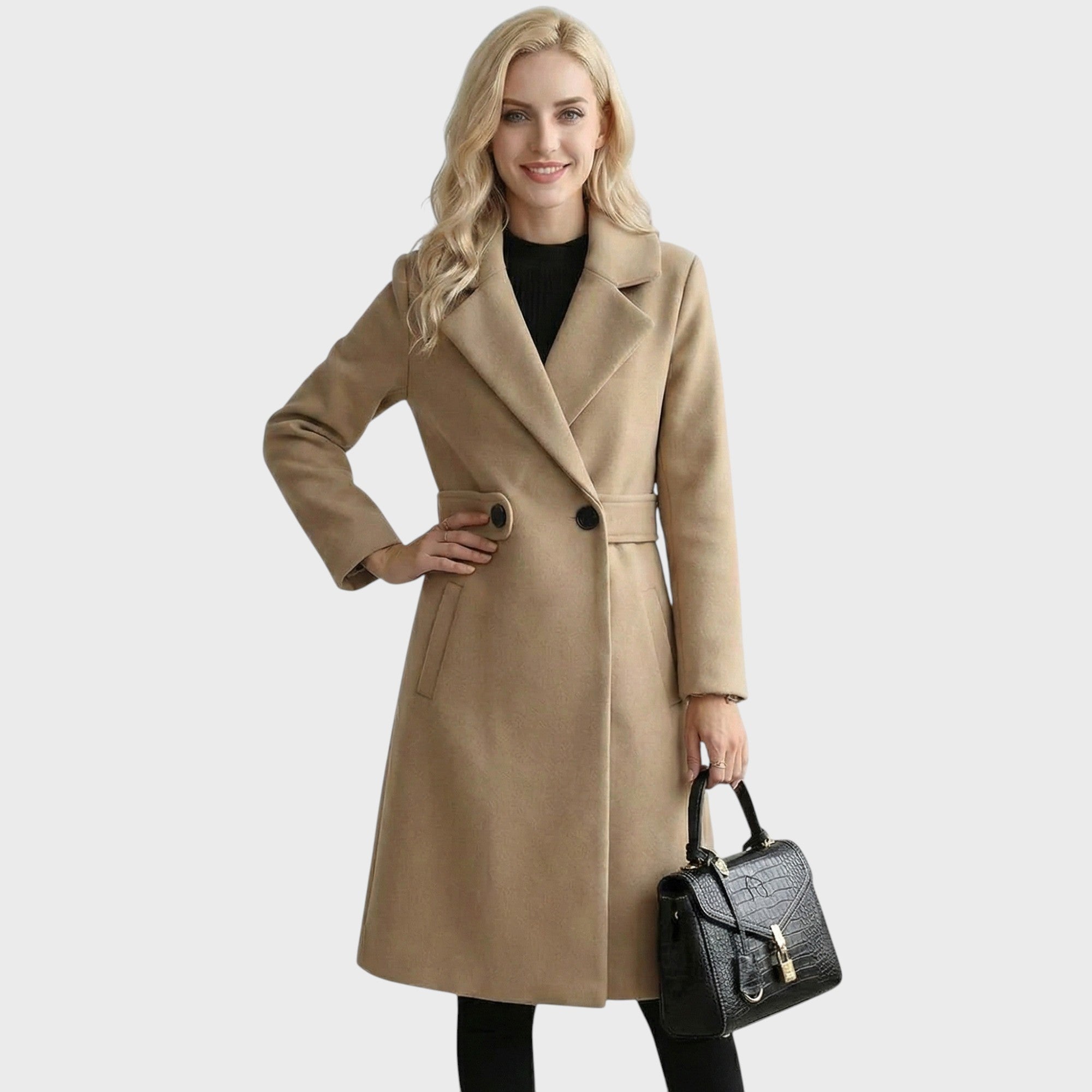 • Nadčasový design: Široké klopy dodávají kabátu dramatičnost a eleganci, zatímco čistá zadní část s jemným detailem pásku působí velmi minimalisticky.