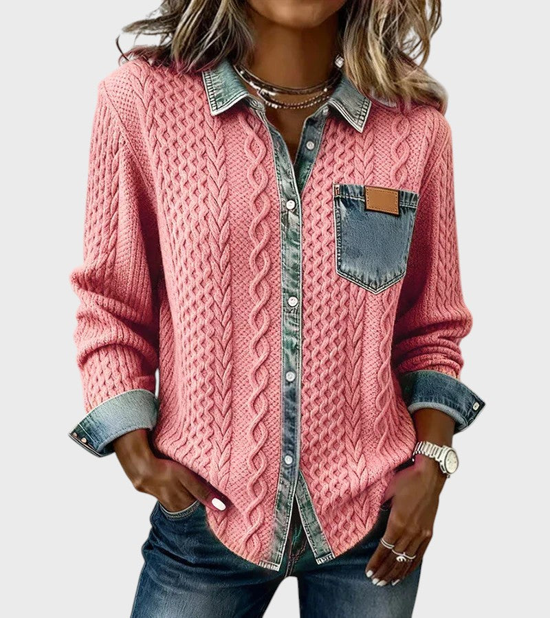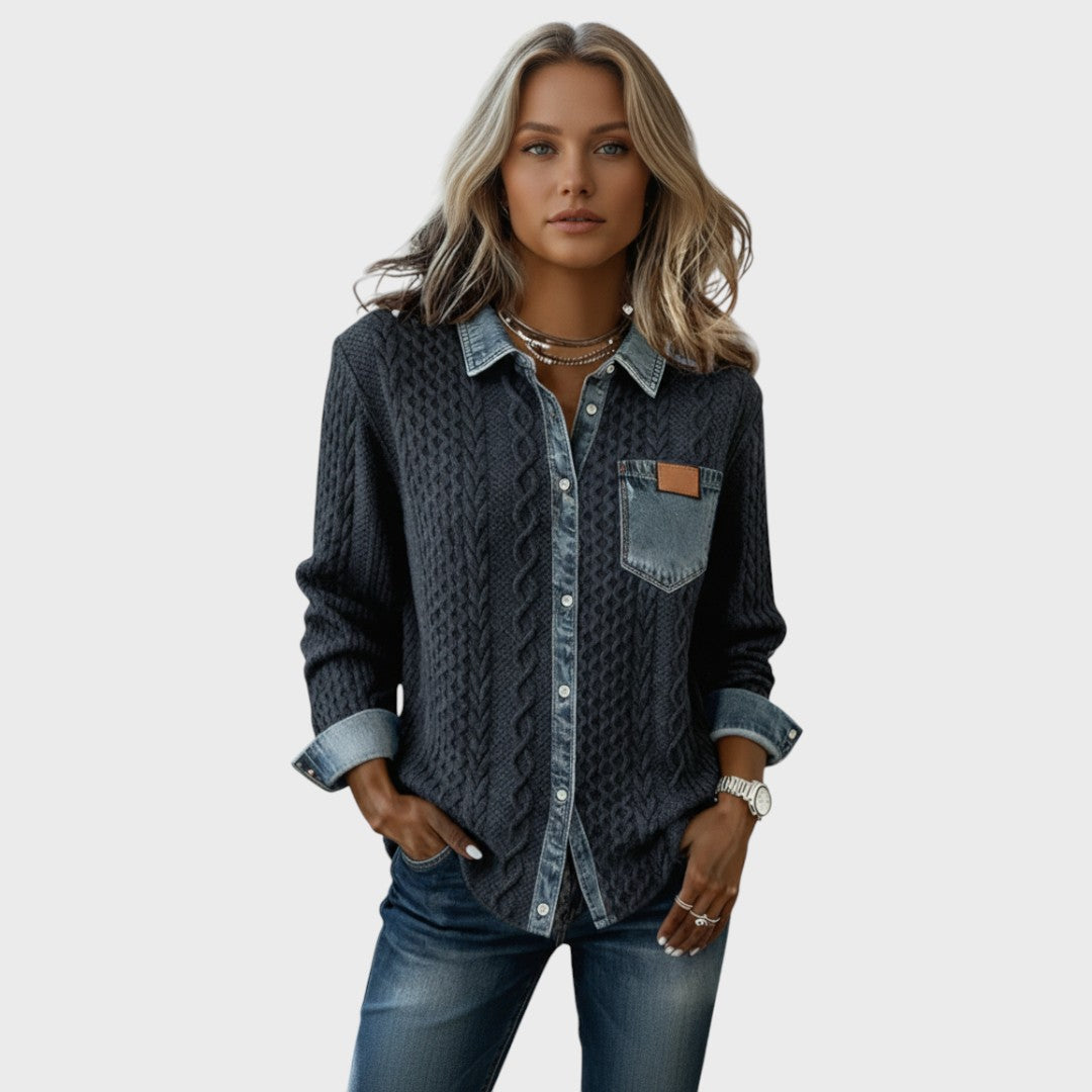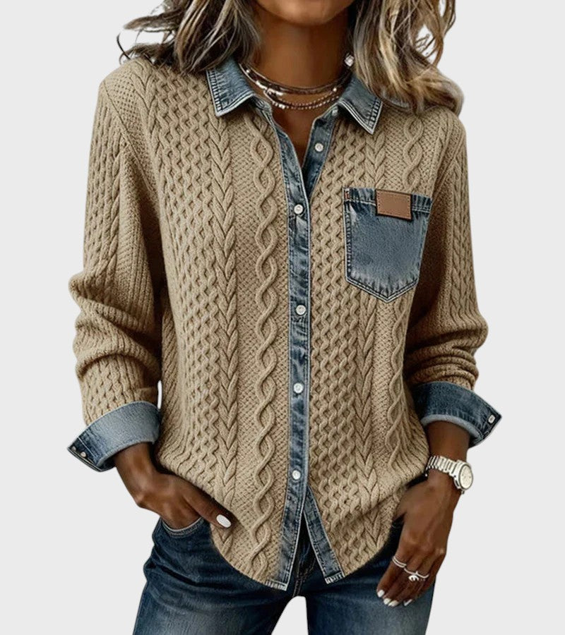 Model Mia je dokonalým spojením pohodlí a ležérního stylu. Tento unikátní kousek kombinuje měkkost klasického pleteného svetru s "cool" faktorem džínové košile. Tělo je tvořeno strukturovaným úpletem s copánkovým vzorem, zatímco límec, léga s knoflíky a manžety jsou z džínoviny, což vytváří moderní a neokoukaný kontrast.