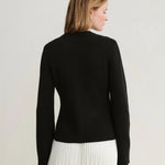 Klasické detaily: Elegantní knoflíky a čistý kulatý výstřih dodávají svetru nádech luxusního minimalismu.