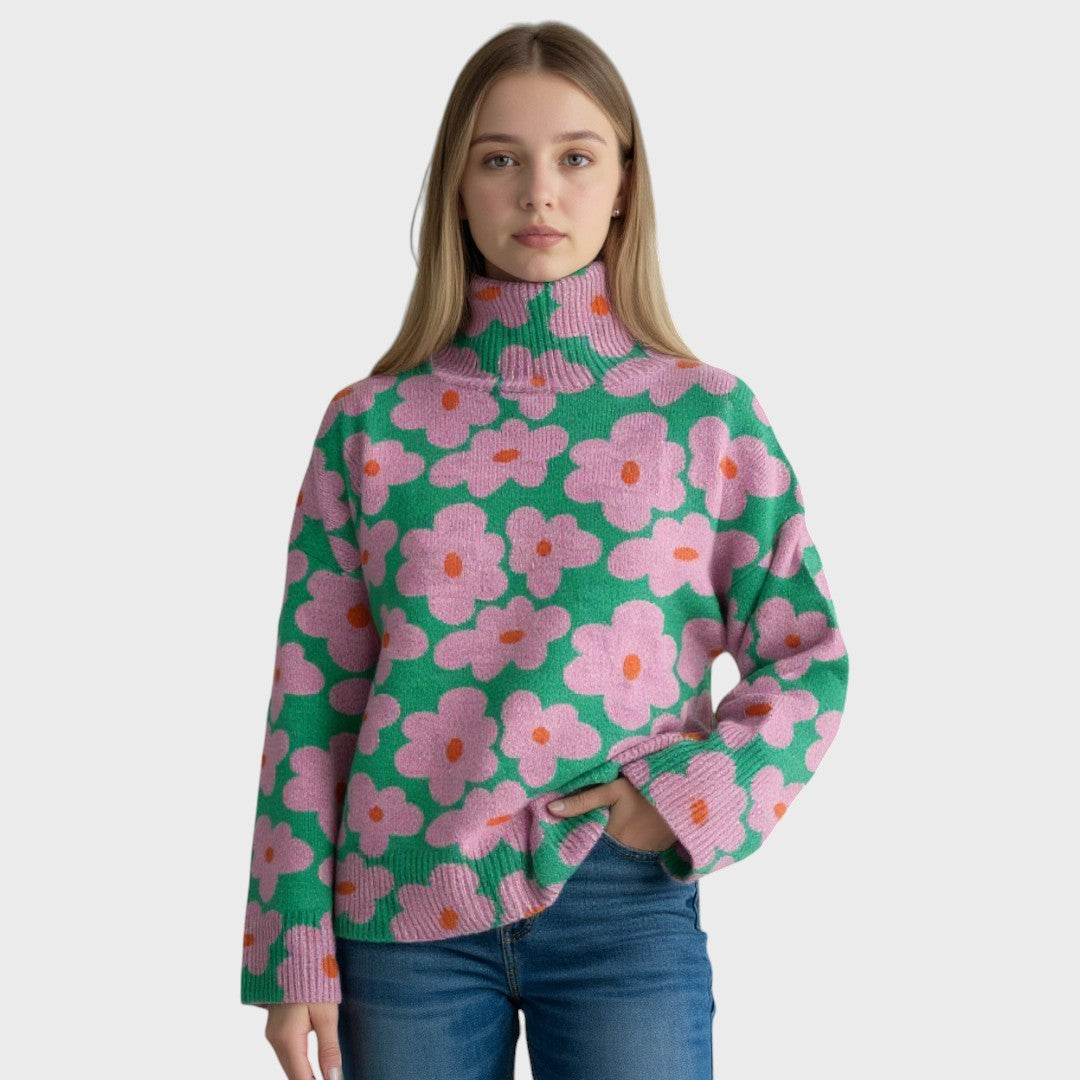 Model Daisy je zábleskem radosti a barev do vašeho zimního šatníku. Tento úpletový svetr s výrazným květinovým potiskem v retro stylu okamžitě rozjasní i ten nejšedivější den. Kombinace svěží zelené a hravé růžové vytváří energický kontrast, který působí mladistvě a optimisticky.