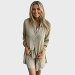 Model Lina je esencí letní pohody a přirozené elegance. Tento dvoudílný komplet, vyrobený ze 100% lnu, je navržen pro dny zalité sluncem, kdy toužíte po maximální vzdušnosti a stylu. Set se skládá z volné košile s klasickým límečkem a pohodlných kraťasů, které společně vytvářejí harmonický "vacation look".