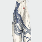 Jumpsuit Octopus z plátna kombinuje umění a styl v působivém kousku. Na přírodně bílém pozadí se rozvíjí modrý japonský vzor chobotnice s detailními prvky, čímž vytváří námořnickou atmosféru, která upoutá pozornost.