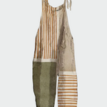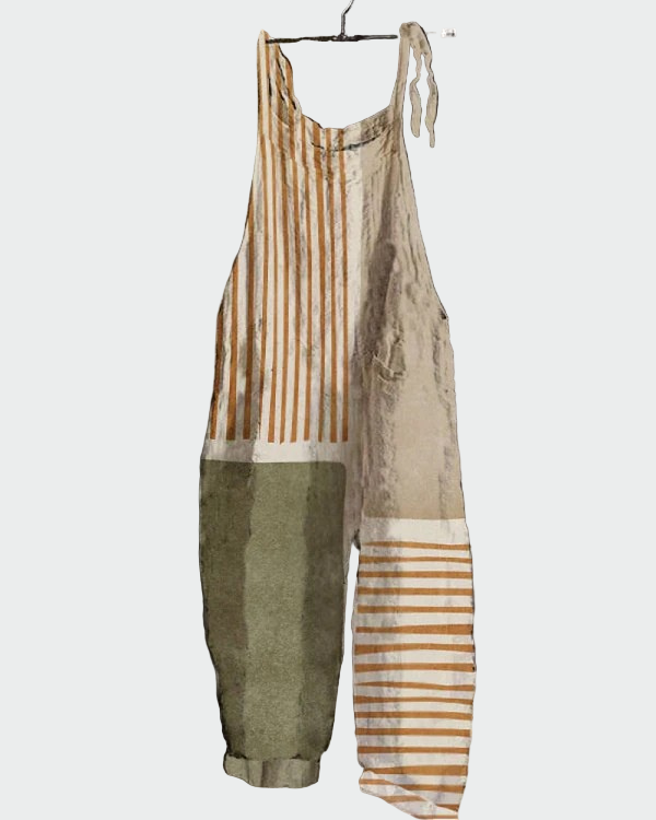 Jumpsuit Kunstnerisk Harmoni vyniká svým jedinečným designem. Geometrické pruhy a barevné kombinace vytvářejí osobitý vzhled, zatímco volný střih zaručuje pohodlí a styl.