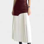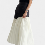 Odvážná a sofistikovaná, sukně Noelle mistrovsky kombinuje různé textury pro moderní a vytříbený vzhled. Díky patchworkovému designu z šifonu a imitace kůže, plisované siluetě a asymetrickému střihu dodává každému kroku pohyb a osobitost. Perfektní pro ty, kteří chtějí vyniknout stylem i strukturou.