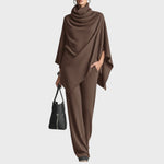 Model Elena přináší do vašeho šatníku novou úroveň ležérního luxusu. Tento dvoudílný komplet, skládající se z asymetrického ponča s bohatým rolákem a kalhot se širokými nohavicemi, je navržen pro ženy, které nechtějí dělat kompromisy mezi pohodlím a elegancí. Monochromatický vzhled opticky prodlužuje postavu a vytváří sofistikovanou siluetu, která působí nenuceně a dráže.