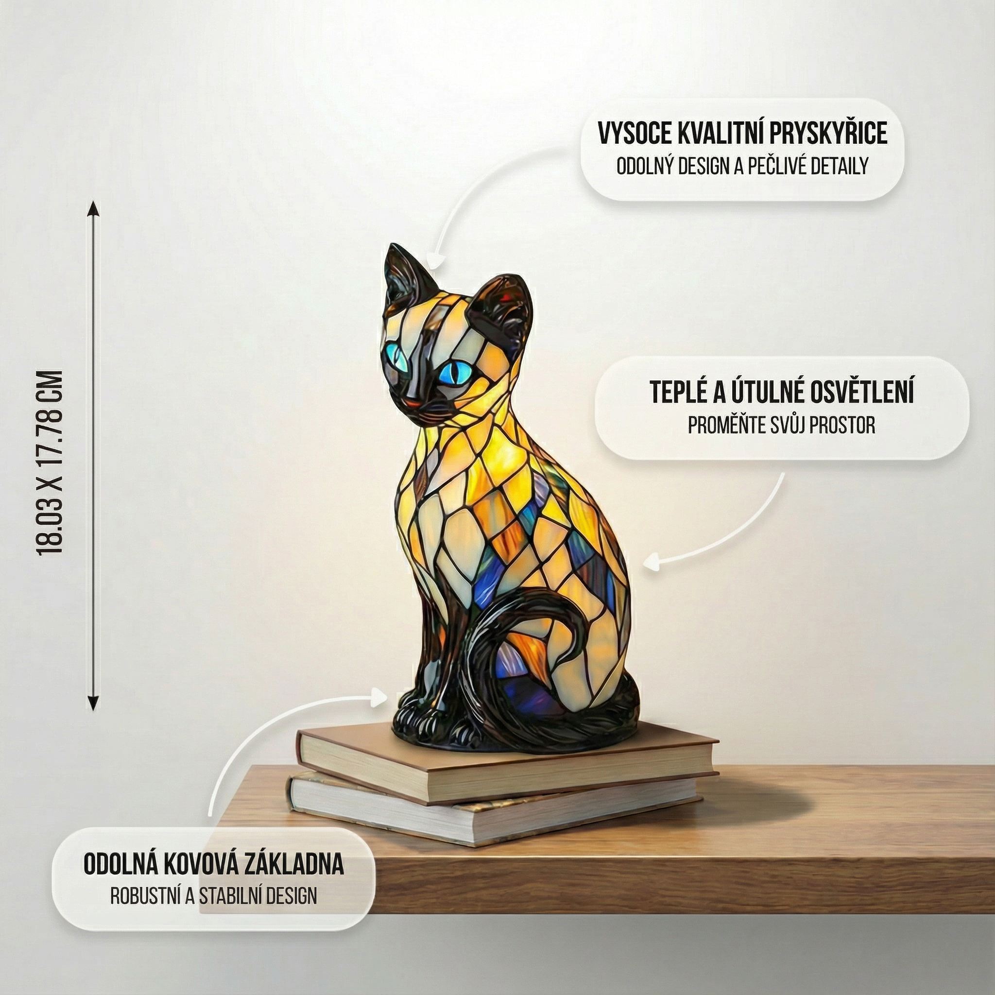 Lampa Mystický kočka je dokonalým doplňkem pro každého, kdo chce oživit svůj prostor. Její design s živými barvami z vitráží vytváří veselou, odvážnou a jedinečnou atmosféru. Lampa vydává jemné a uklidňující světlo, které promění každý kout v elegantní a útulné místo. Její kompaktní rozměry ji dělají ideální pro noční stolky, komody nebo jakýkoli prostor, který potřebuje rozjasnit.