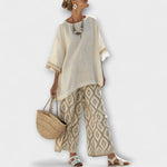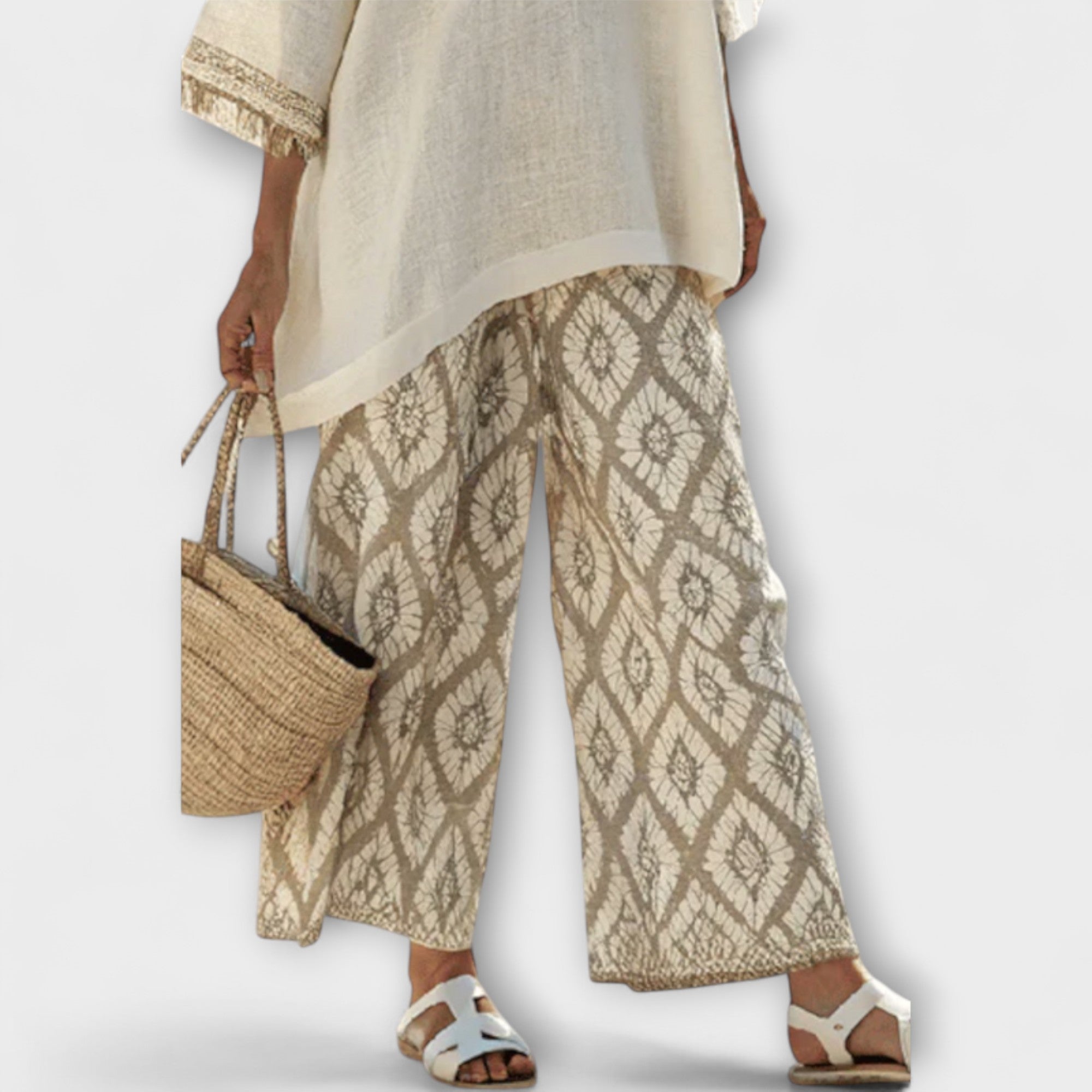 • Kalhoty s širokými nohavicemi a etnickým potiskem, které dodávají osobnost