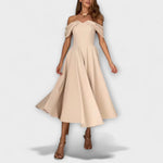 Oživte svůj šatník našimi úchvatnými midi šaty s odhalenými rameny, které lichotí každé postavě. Křivkový výstřih do srdce a sochařské rukávy odhalených ramen dodávají nádech ženskosti, zatímco přiléhavý korzet a rozšířený midi lem vytvářejí klasickou siluetu přesýpacích hodin.