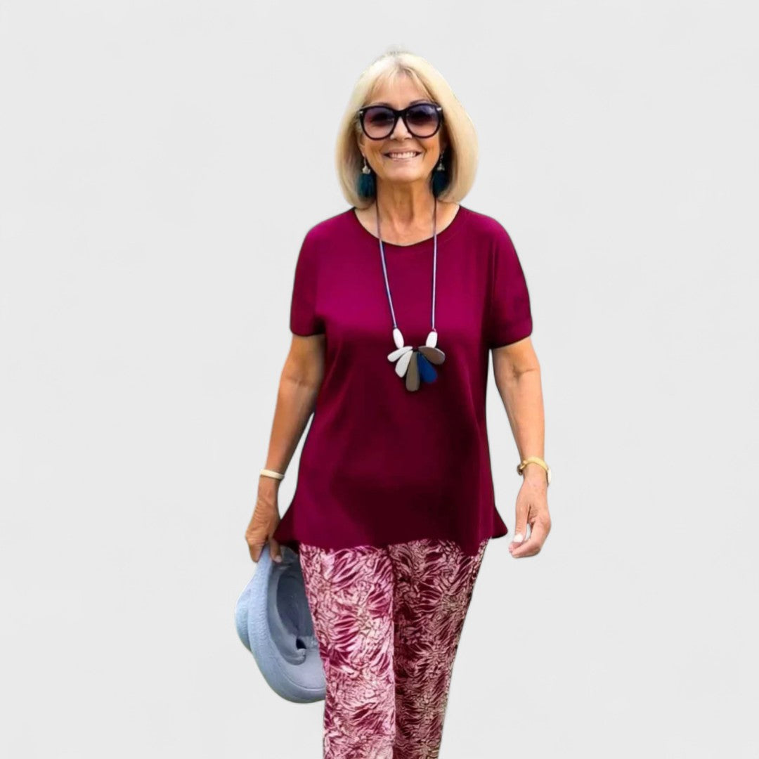 Tato dvoudílná souprava je dokonalým spojením elegance a komfortu. Její lehký a vzdušný materiál je příjemný na dotek a zaručuje, že se v ní budete cítit skvěle po celý den. Krásně tvarovaný střih s širokými kalhotami a stylovým topem vytváří sofistikovanou, a přesto uvolněnou siluetu, která se hodí pro každou příležitost.