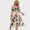 Tyto stylové maxi šaty kombinují moderní abstraktní potisk s lichotivým střihem. Jemný výstřih do V a objemné puff rukávy dodávají elegantní a trendy nádech, zatímco elastický pas vytváří štíhlou siluetu. Vzdušná tkanina zajišťuje bezproblémový chic vzhled, ideální pro různé příležitosti.