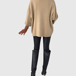 Tento svetr s volným střihem kombinuje eleganci s ležérním šarmem. Jeho čistý výstřih, rukávy s knoflíky a volný silueta z něj činí univerzální kousek pro vrstvení nebo nošení samostatně.