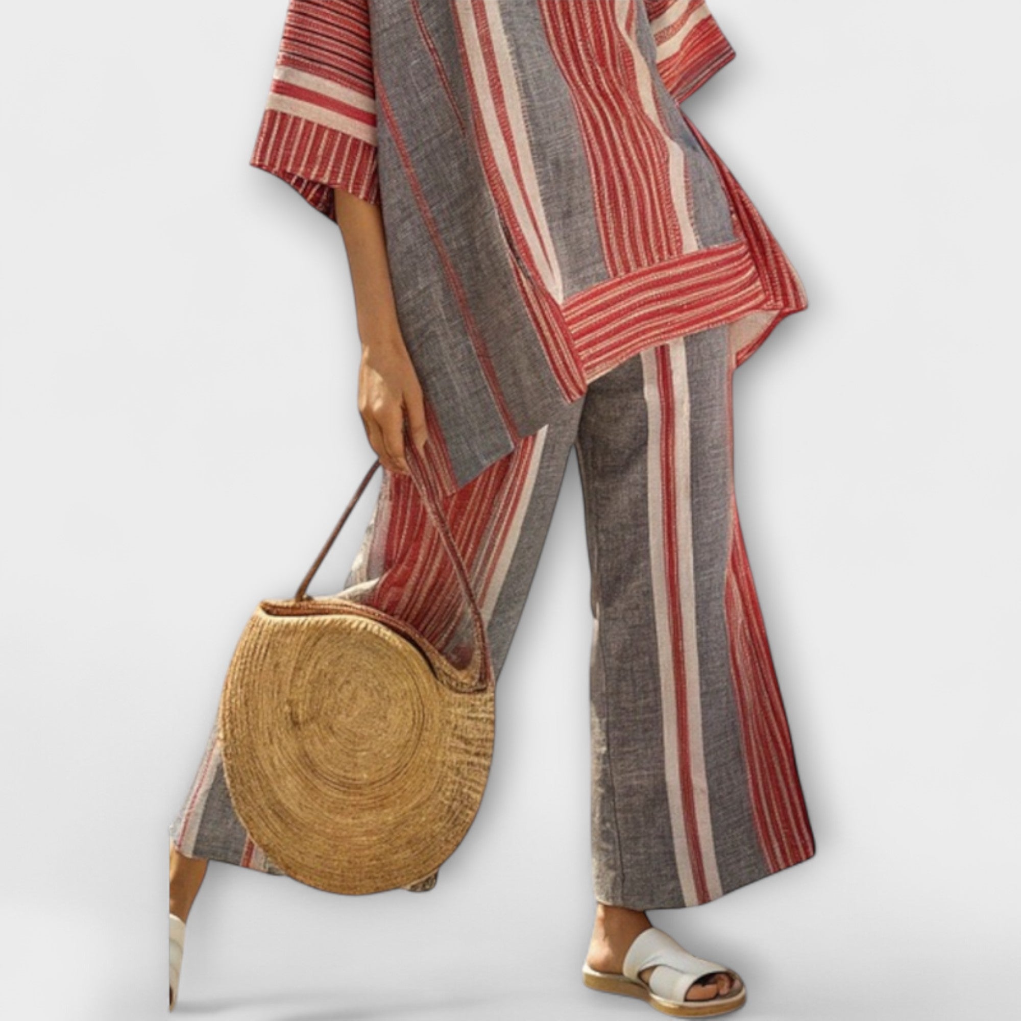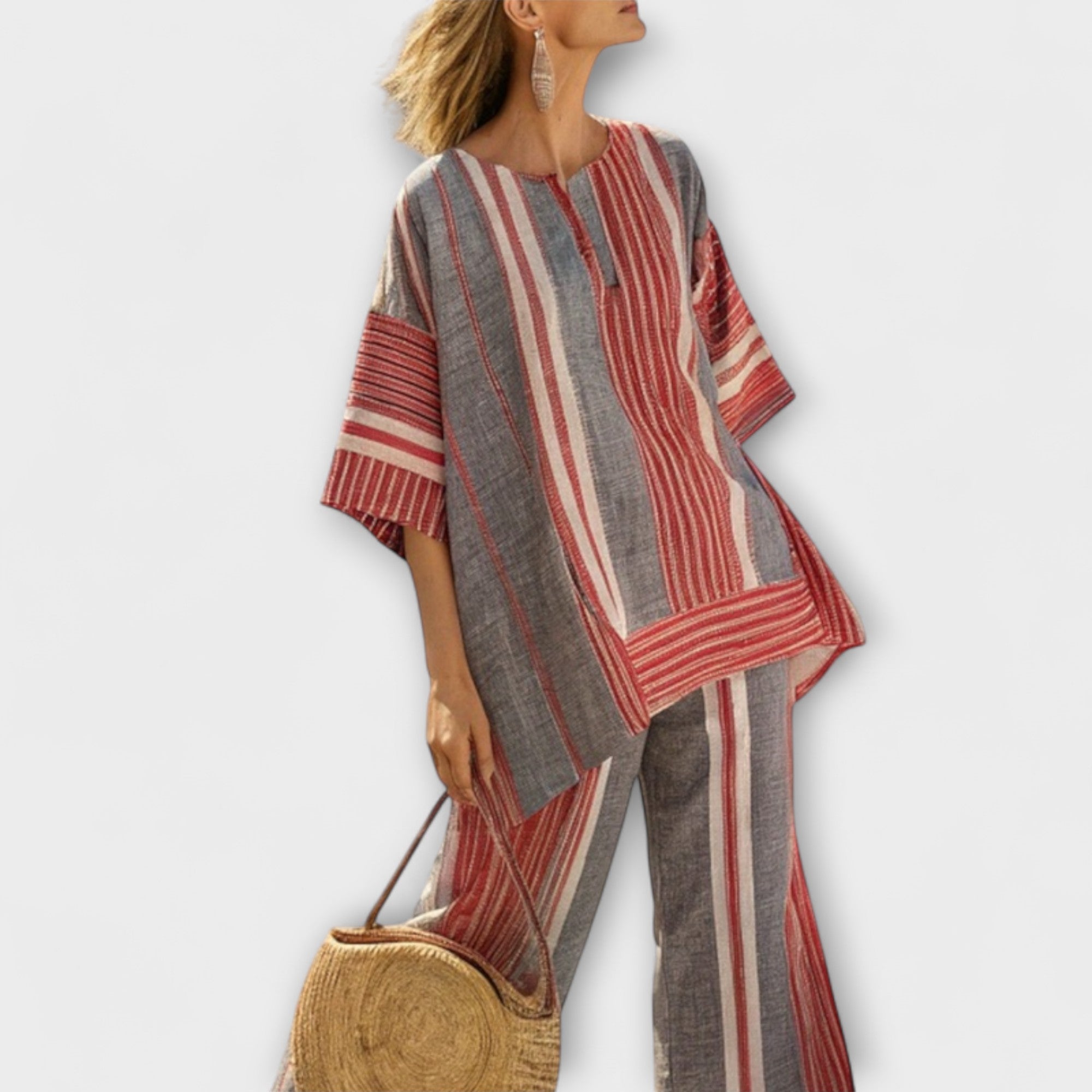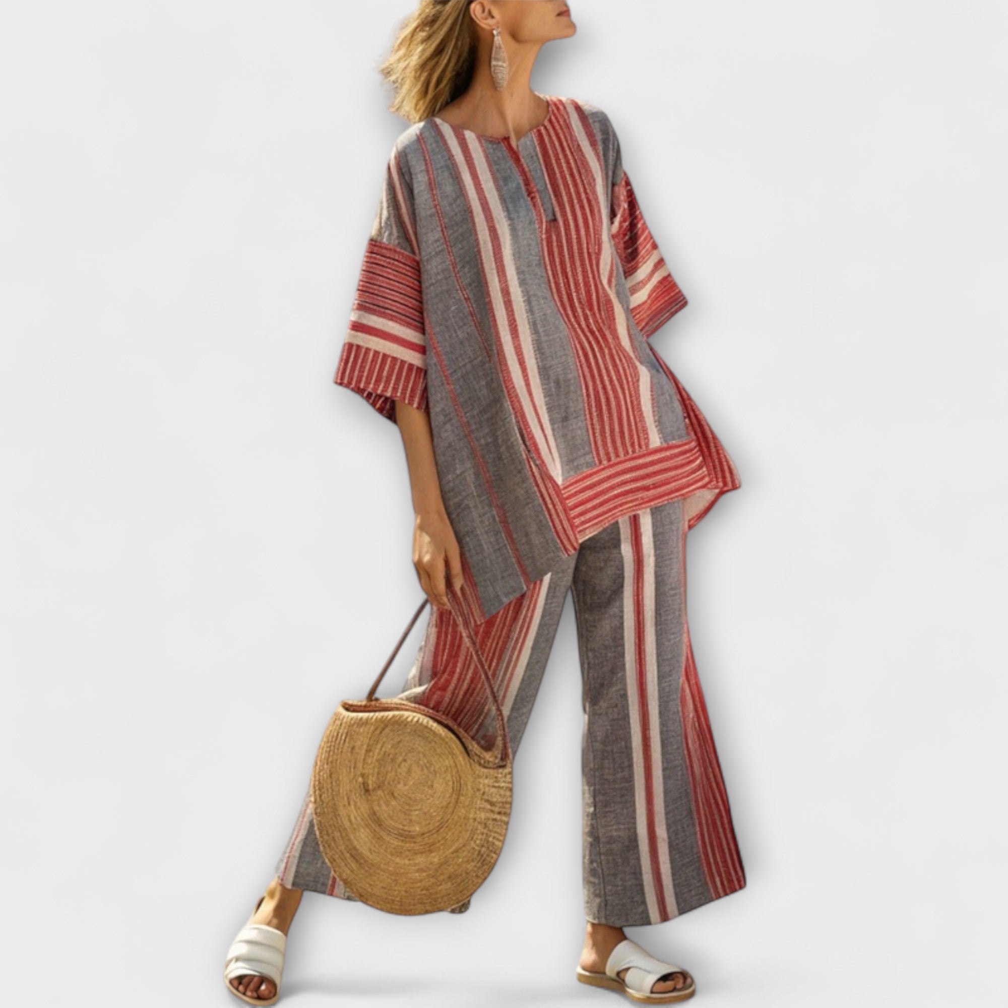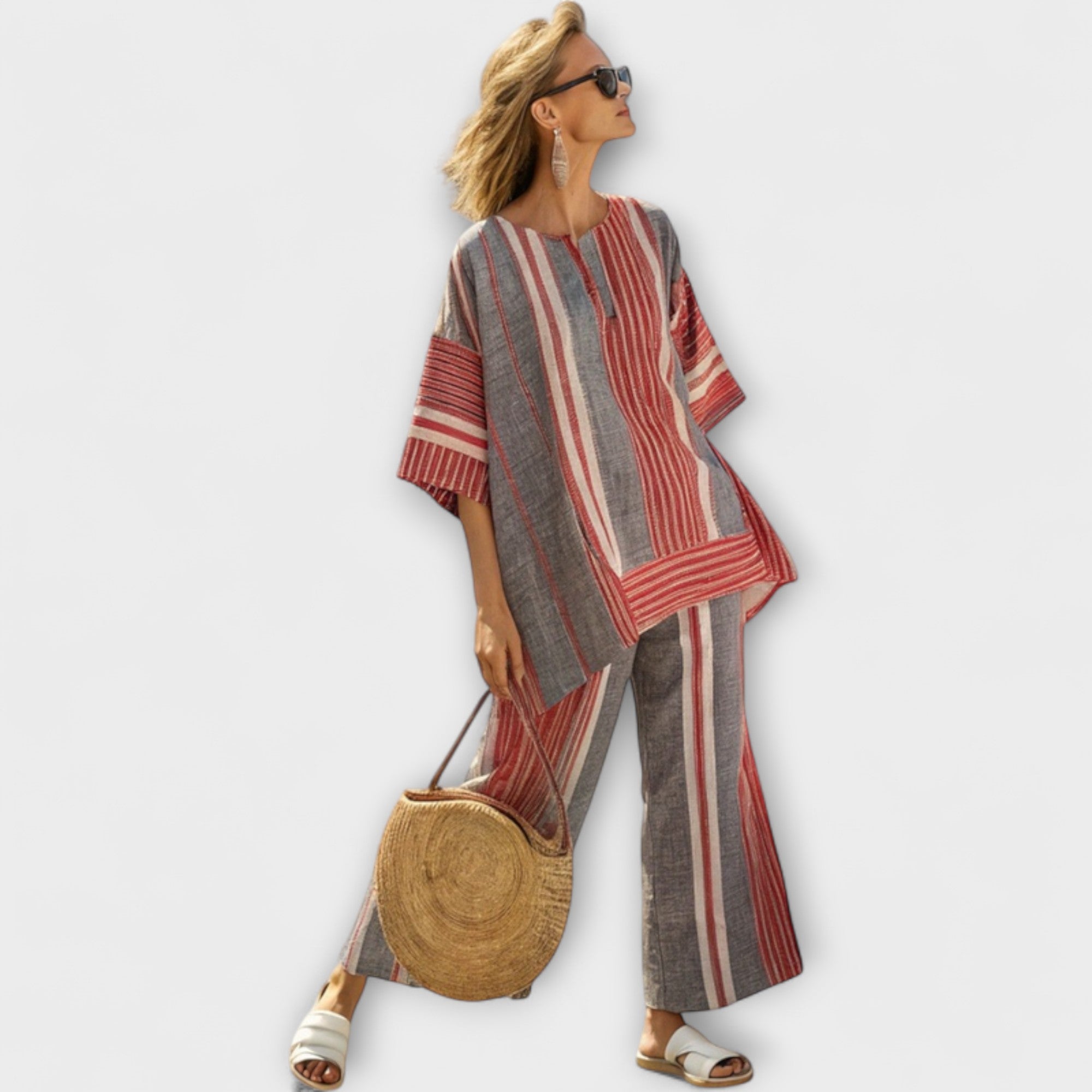Přijměte středomořskou atmosféru s naším Daisy Setem, ideálním pro ty, kteří ocení uvolněný, ale stylový vzhled. Tento set se pyšní krásnou kombinací korálových pruhů a kamenitě šedých tónů, vytvářející širokou a splývavou siluetu, která zachycuje podstatu léta.