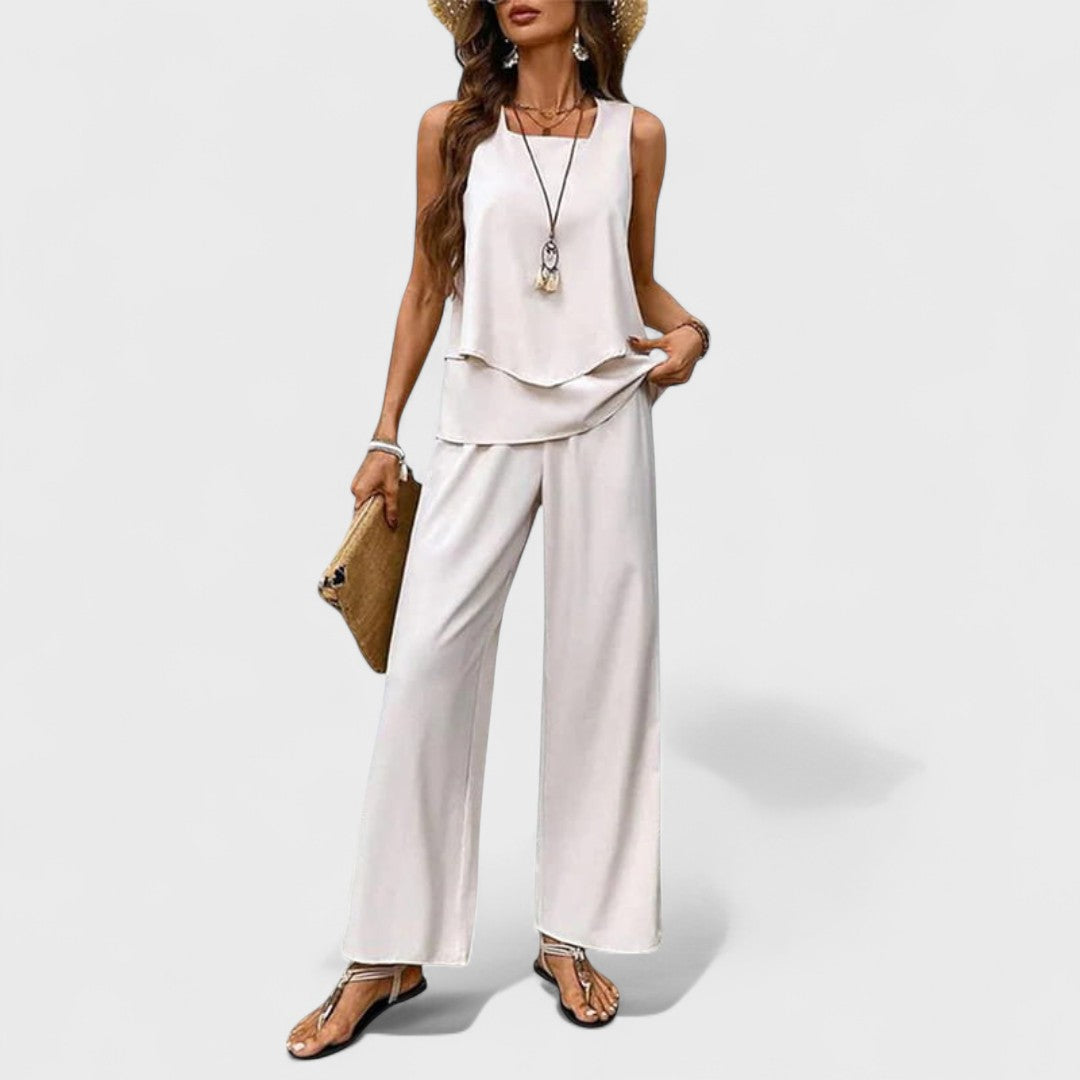 Set Katarína přináší luxus jednoduchosti a pohodlí ve stylové kombinaci. Horní část bez rukávů jemně obepíná postavu, zatímco lehké kalhoty s volným střihem dodávají pocit vzdušnosti a svobody. Vyrobený z kvalitního materiálu s jemným leskem, tento set je skvělou volbou pro pracovní dny, setkání s přáteli či letní večery plné elegance.