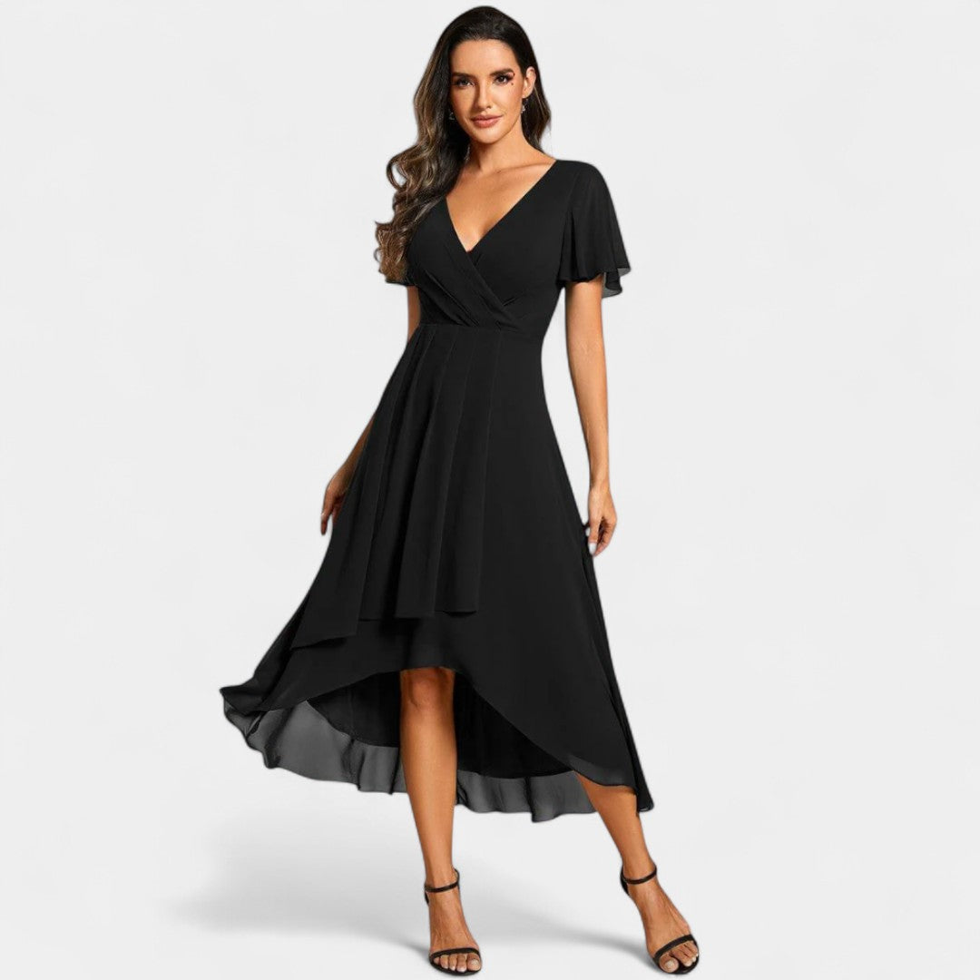 Asymetrická sukně dodávající šatům jedinečný šmrnc