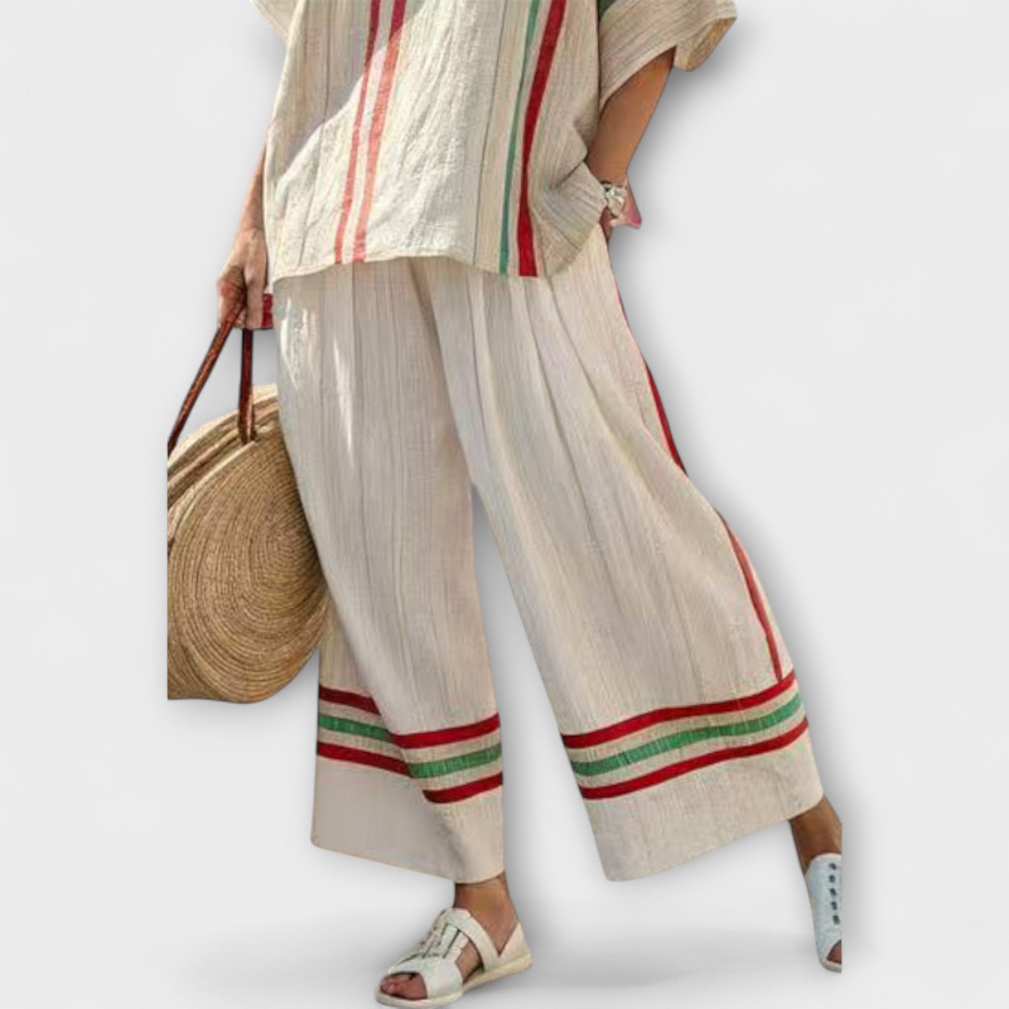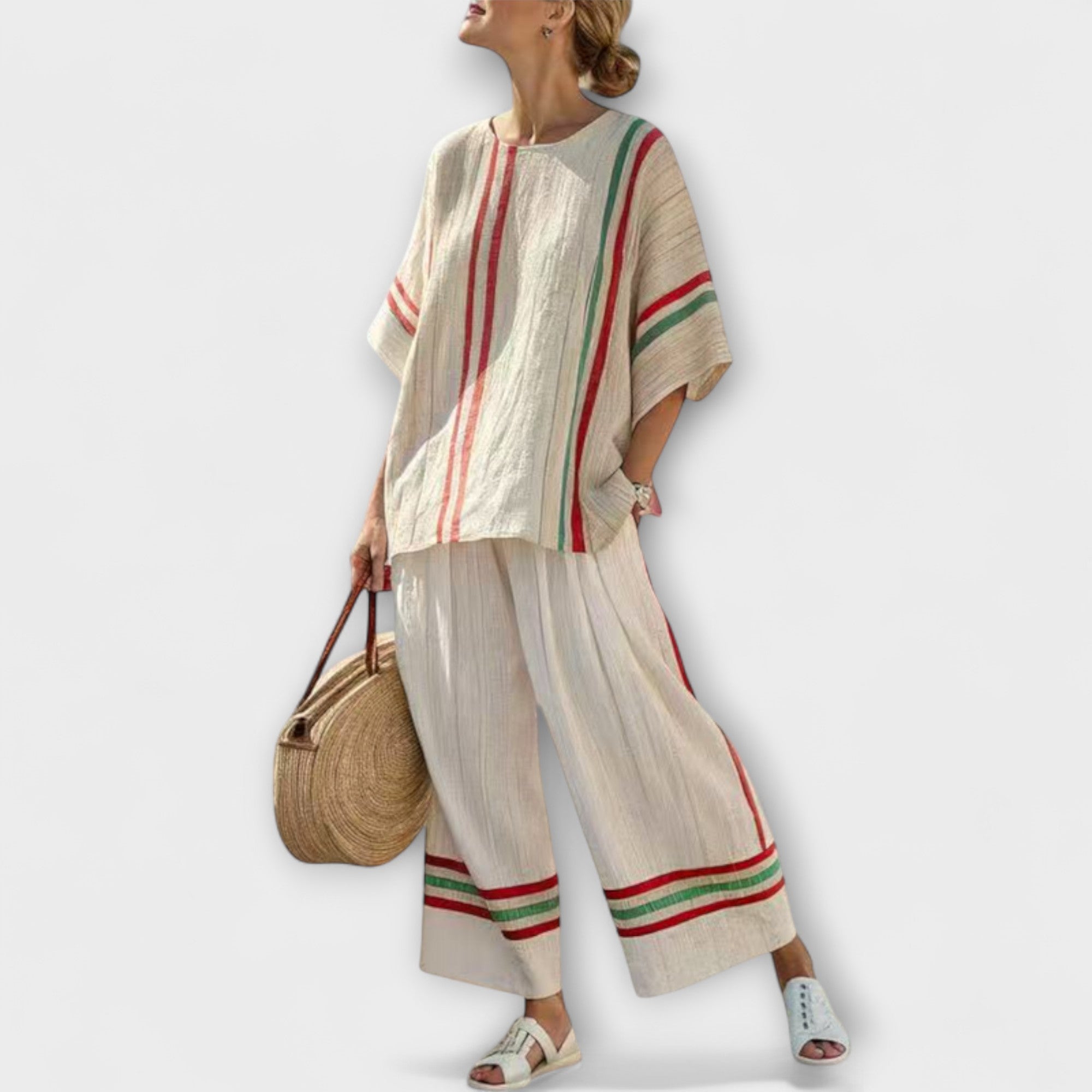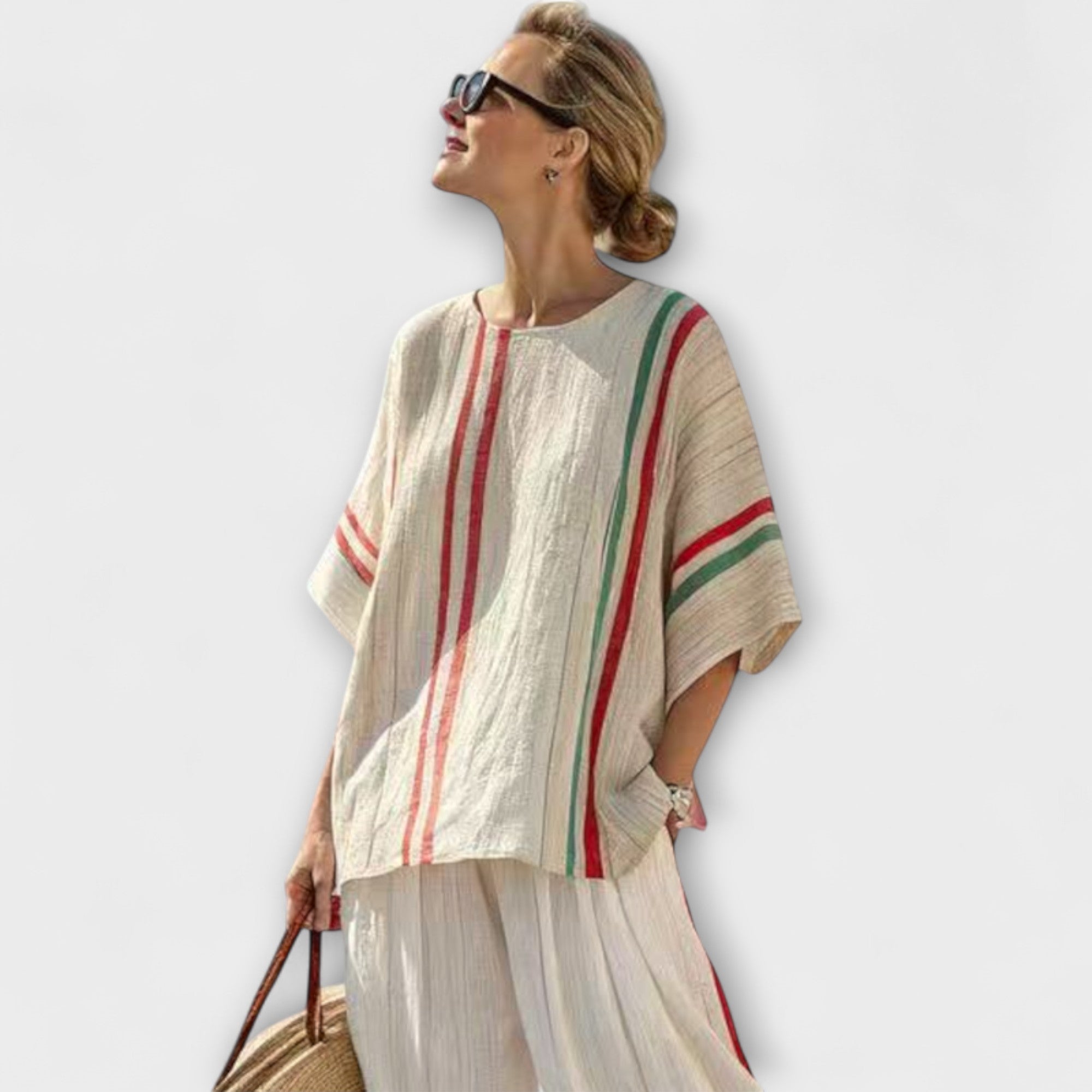 Inspirovaný osvěžujícím mořským vánkem, Daisy set kombinuje přirozený základ s živými červenými a zelenými pruhy, které vytvářejí dokonalou rovnováhu mezi klasickou elegancí a veselým kouzlem.