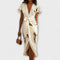 Okouzlující midi šaty se zavinovacím stylem a živým listovým potiskem, které lichotí postavě díky V-výstřihu. Ideální pro jakoukoli příležitost, od brunchů po venkovní akce.