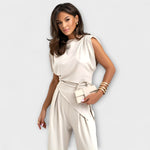 Skulpturální elegance s moderním nádechem: Komplet Sofia kombinuje asymetrický top s širokými kalhotami pro siluetu, která je stylová a elegantně splývá. Ideální pro zvláštní příležitosti nebo pro snadné vylepšení vašeho každodenního vzhledu.