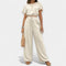 Tento set vyniká volným střihem a naprostým pohodlím, které nabízí. Krátký top s nafouklými rukávy se harmonicky kombinuje s vysokým kalhotami s tkaničkou, čímž vytváří stylový vzhled s boho akcenty – ideální pro nejteplejší dny v roce.