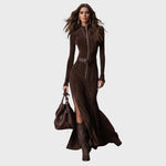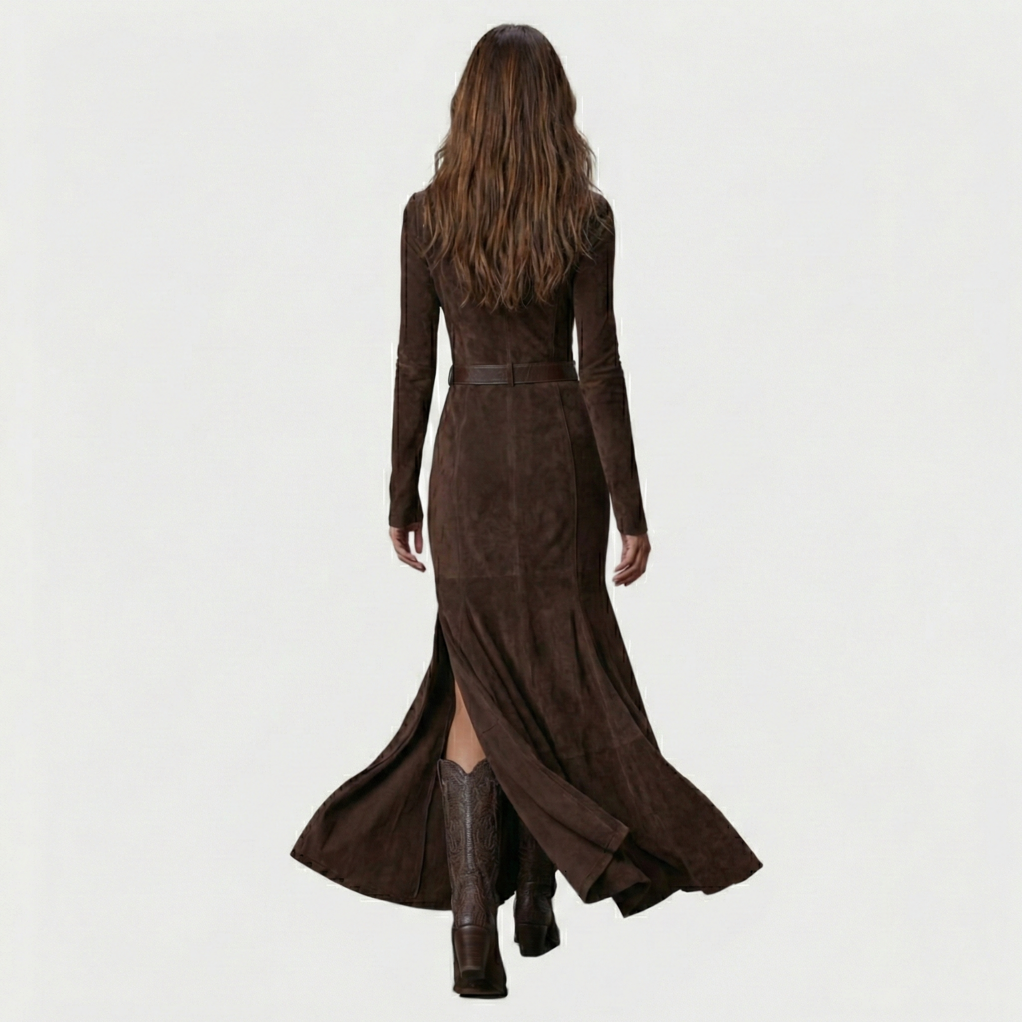 Model Valentina definuje moderní pojetí stylu "Western Luxe". Tyto dlouhé šaty v sytém, čokoládově hnědém odstínu jsou vyrobeny z prémiového materiálu imitujícího semiš, který je na dotek sametově hebký, ale zároveň dostatečně pevný, aby držel tvar. Propracovaná panelová konstrukce a integrovaný pásek vytvářejí siluetu, která působí mocně a žensky zároveň.